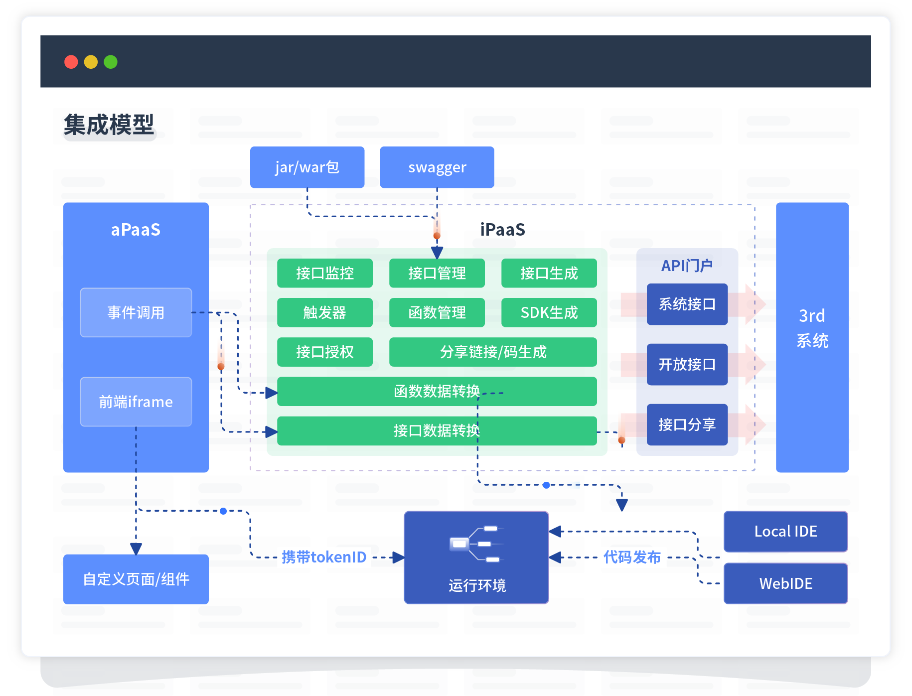 集成模型包括平台本身前、、、、、、、、、、、后端能力的扩展,,,,,,,,,,,,,,也支持通过API门户和第三方系统进行交互。。。。。。。。。。。