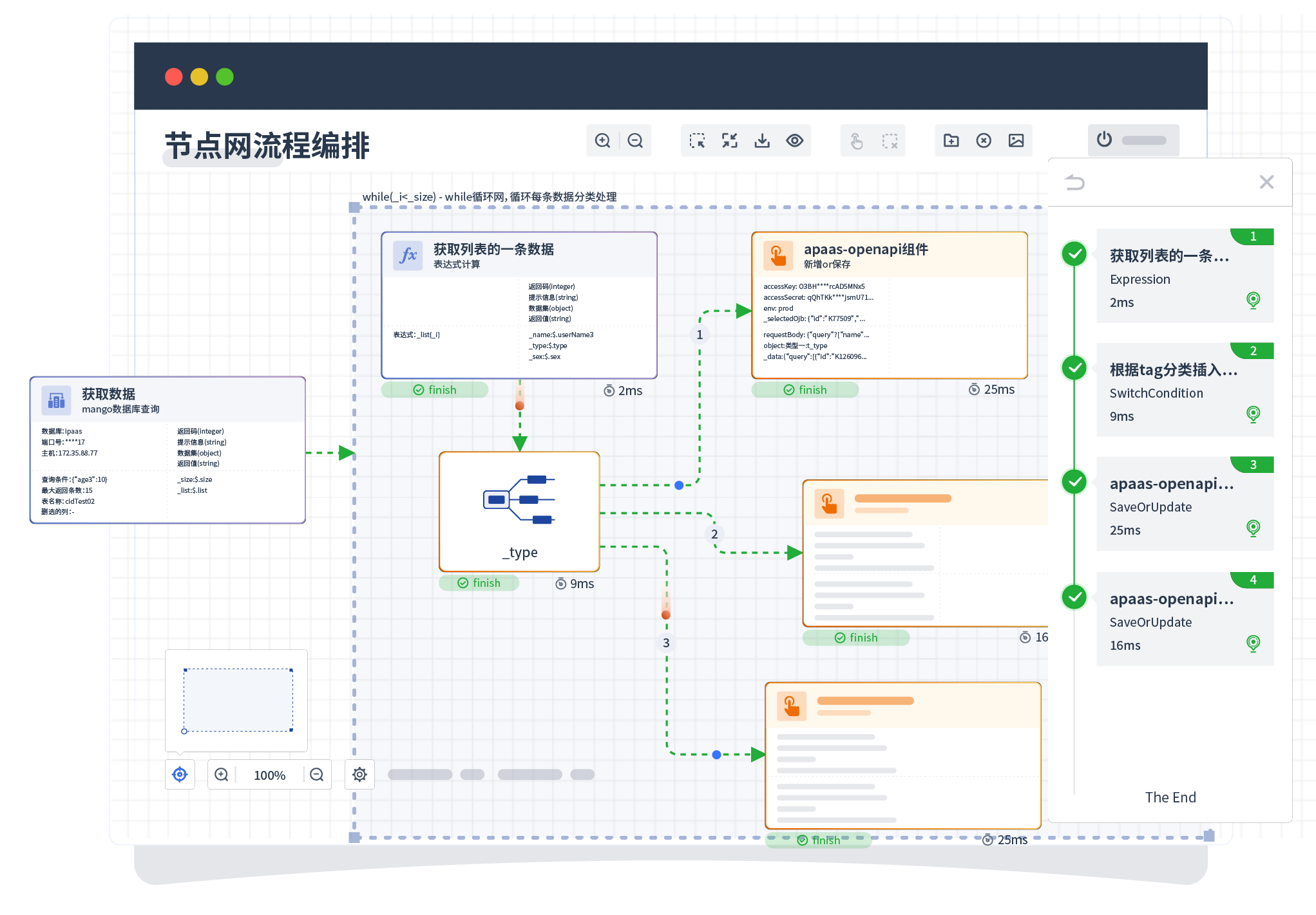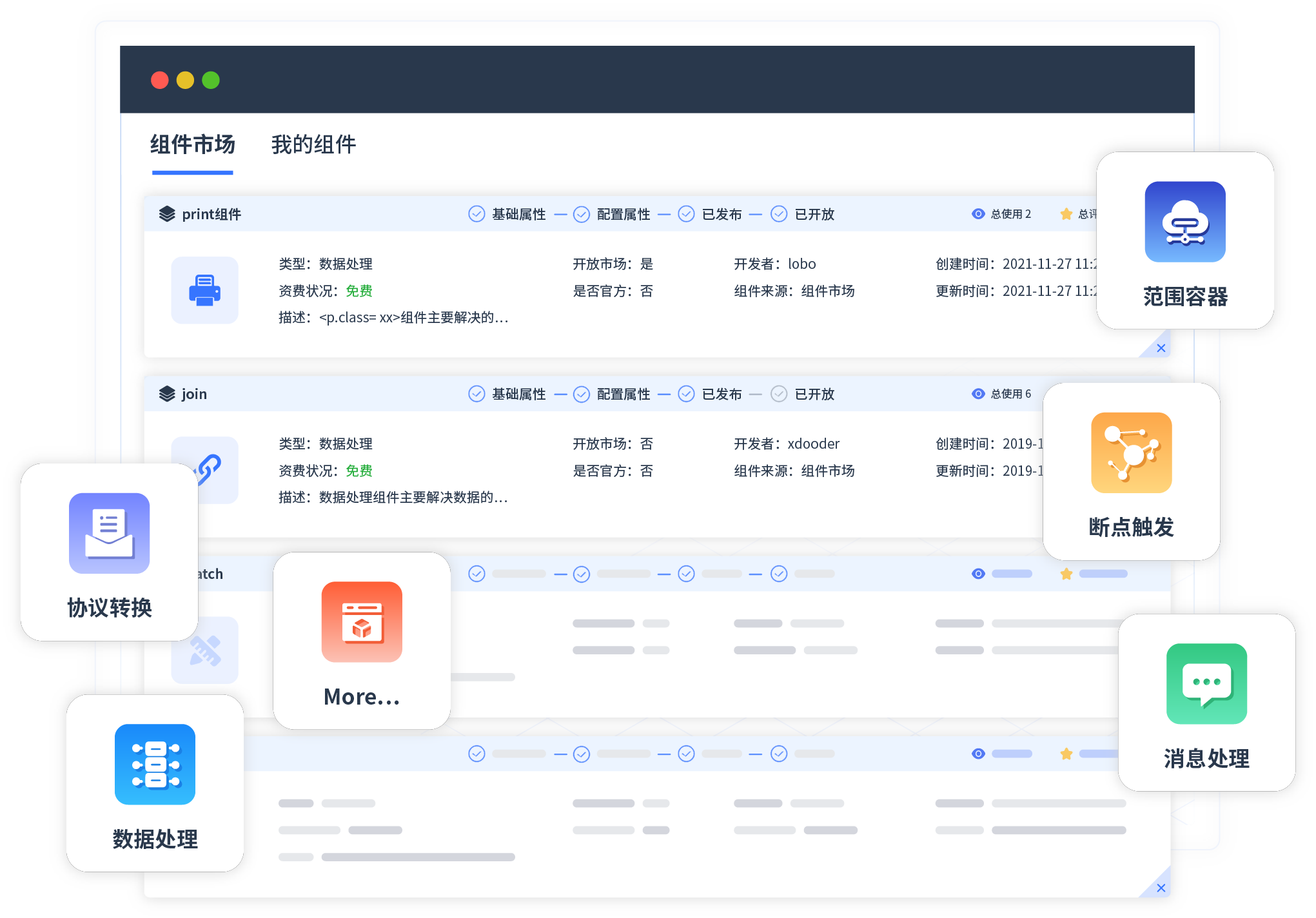 针对集成场景,,,,,,,,,,,,,,,,组件定义后支持进行流程编制,,,,,,,,,不同于传统代码方式,,,,,,,,,,,通过图形化展示,,,,,,支持在线调试、、、、、、、、日志查看和运行回放。。。。。。。