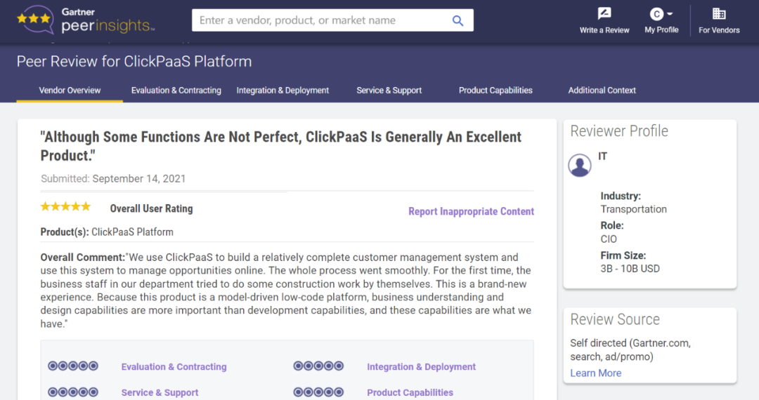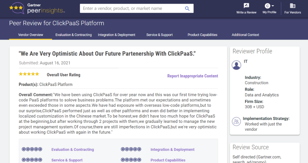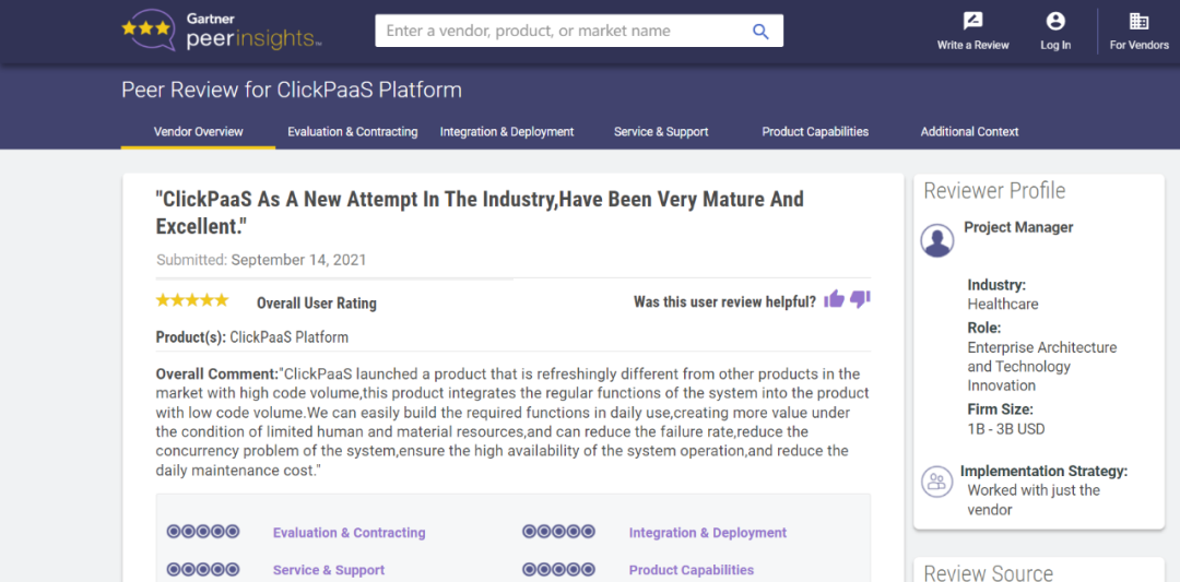 Tips:::::::::【Peer Insights】——用户对企业IT产品和服务发布真实评价的平台。。。。。。。。。。。目前已有355个市场,,,,,,,,,,,,255,000条经过验证的评价。。。。。。每一条评价Gartner会针对参评企业营收规模及参评人员信息做验证、、、、、、、、、、、、评价内容做多维核实。。。。。。。。
